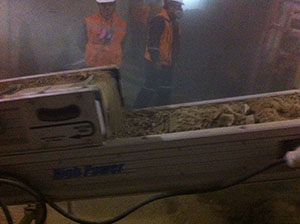 Cuadrillas de trabajo realizando la labor de forma manual con palas y carretillas, con un procedimiento de acopio y traslado manual al lugar distante 100 mts app, por túnel en desnivel. Luego con maquinarias se retira el material acopiado para devolverlo al proceso.